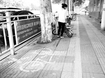 6月30日,常青路两侧的非机动车停放区已施划完毕,黄色的标识线从济安桥路路口延续到琵琶山路路口。非机动停车区域处于人行道路沿石和盲道之间,宽约1.5米,区域内每隔三四米就印有一处自行车车标,让市民能够一目了然。