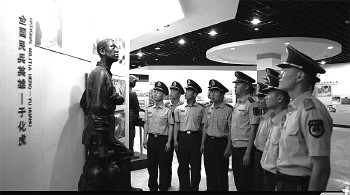 6月30日,武警山东总队烟台支队组织官兵到海阳地雷战纪念馆进行爱国主义教育,用“抗战”精神激励官兵争做新一代革命军人,深化主题教育效果,图为官兵们参观“活雷大王”于化虎塑像。
