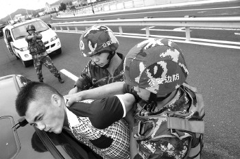 6月30日,养马岛大桥附近传来一阵嘈杂声,三名“歹徒”手持凶器在路上追逐砍杀“群众”,边防公安的战士接到报警后迅速出击,赶到现场在警示无效的情况下“击毙”两名“歹徒”,一名“歹徒”夺车逃窜,随后被边防公安战士驱车截下并将其抓获,这是烟台边防支队举行的一次反恐演练。