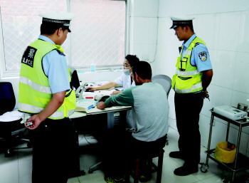 高速路沂源下路口执勤交警将被蛰伤的司机紧急送医院。