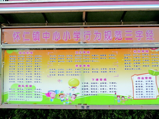 农村学生跟城区学生相比,最大的一个特点就是农村学生比较调皮、好动,他们的行动轨迹一般不受家长、老师的控制。为此怀仁镇中心小学提出要规范走姿,要求学生们挺胸抬头、摆臂阔步,要走出气质、走出“阳光的感觉”。并且学生们在日常活动中要做到“两静”。两人交流,不能惊动第三人,教室内、走廊、楼梯间彼此打招呼要平心静气,不能干扰了其他人。