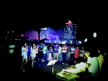 盛夏来袭,每个夜晚明月湖风景区内的消暑活动比比皆是,而近日,街头露天唱吧渐渐火了起来,不少市民参与其中放声高歌。 本报记者 刘振 摄