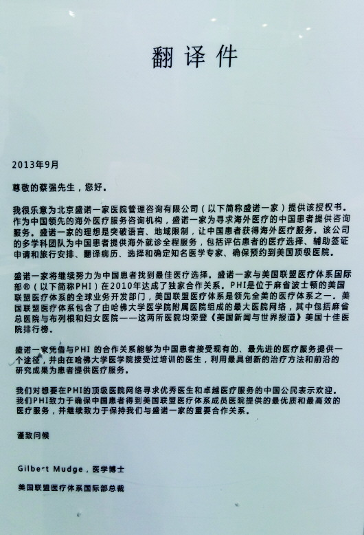 蔡强说,从2009年开始筹建盛诺一家,到2011年正式注册,就是要通过不懈努力,使国内居民能够充分利用全球先进的医疗资源,尽可能地减少因疾病带来的痛苦,并通过与国外权威医疗机构签署正式合作协议,确保能够从法律上保障国内居民去国外看病的合法权益。目前已经与美国梅奥诊所、麻省总医院、布列根和妇女医院、波士顿儿童医院、丹娜法伯癌症研究所以及刘翔奥运会期间手术的医院英国惠灵顿医院、英国国王学院附属医院、英国最好的心脏病医院皇家布朗普顿医院等在内的国外权威医疗机构签署了战略合作协议,可以为国内居民提供全面、权威、可靠的出国看病、出国体检、远程会诊、质子重离子治疗等海外医疗一站式服务,并已经帮助千名患者前往国外顶级医院就医,而且在所有流程环节上,解决了患者语言及国外基本生活等方面的困难。
