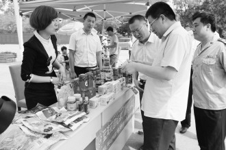 7月2日,滕州市食药监局举办了食品安全主题日宣传活动。滕州市龙泉街道组织了10余家食品安全工作较为出众的商家,在鲁南美食城进行了展示。图为蓝湾花园名品行的工作人员在介绍自己销售产品的特色。 本报通讯员 倪召喜 本报记者 张冬梅 摄影报道