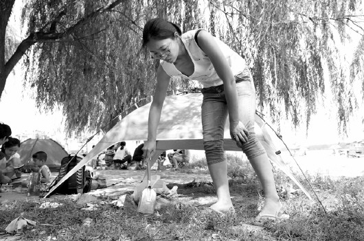 秦倩拿着孩子挖土用的小铲子,先清理帐篷周边的垃圾,有散发着臭味的海鲜烤肉剩渣、竹签,有破碎的啤酒瓶、木炭渣,还有埋在土里的卫生纸、塑料袋。垃圾整成堆后,再装进垃圾袋里。“这一打扫,不仅干净了,心里也舒坦多了。”秦倩说。