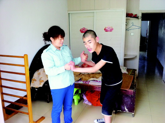 3日,记者来到昌乐县的锦伦天地小区,记者见到了胡家梅和已经17岁的孙熙阳,“现在每天要给他做两次全身按摩,一次半个小时,虽然病时好时坏,但是他现在已经可以扶着墙一点点地在屋里走路。”胡家梅指着墙上的划痕,这都是孙熙阳留下的。