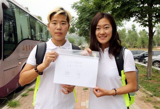 李影(左)与吴海燕(右)回归山东女足,她们写下祝福,希望更多人关注女足发展。 本报记者 王鸿光 摄