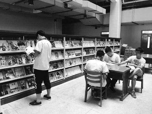 上午大课间,LOFT式的图书馆向学生开放,不少同学去看杂志。