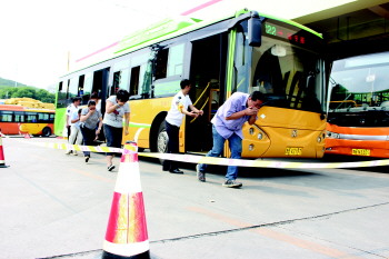 “漏气了,快跑!”“50米外再打电话报警!”5日,青岛公交崂山巴士公司天然气公交事故应急处置演练举行,200多名驾驶员参与。活动现场,救援人员用被喻为“狗鼻子”的天然气探测仪成功找到漏点并堵住,解除了警报。据悉,公交天然气中添加了臭味剂,一旦漏气,可及时发现,燃点比柴油更高,泄漏后相对不易起火,市民可放心乘坐。