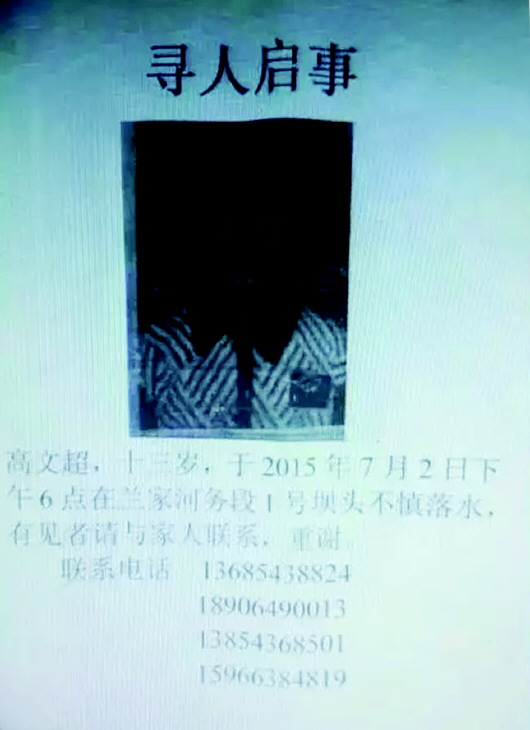 高文超的叔叔高先生介绍,2日下午,高文超考完试刚放暑假,和村里两个小伙伴一起到邻近的兰家村游泳,在黄河兰家河务段1号坝头处下水,由于夏天水流湍急,不会游泳的高文超被水冲走,不见踪影,两个同行的男孩立刻抱起衣服回家告诉大人。得知情况后,高文超的家长和全村人立刻出动,沿黄河边一直打捞寻找,滨州市各救援队也加入救人的行列,一直找到东营,都没有发现孩子的踪影。距离7月2日下午6点孩子落水已经过去了80多个小时,孩子仍然没有音讯,“孩子下水的时候什么也没穿,皮肤黑黑的,眼睛很大,留的长头发,1米4左右的身高。”高先生说:“我在网上、微信上都发了帖子,现在全家人都急疯了,希望如果有好心人看到能赶紧联系我,我的电话是15266765789。”