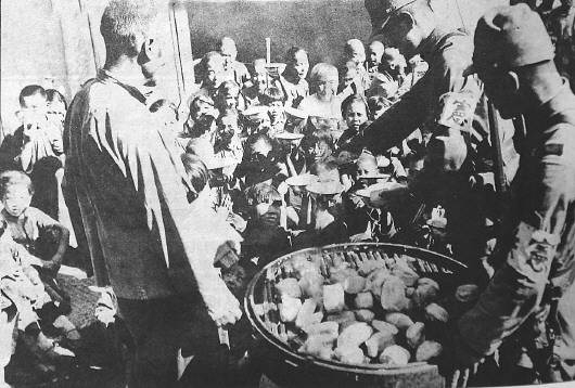 日寇为了掩盖其罪行,美化侵略,消除德州人民对侵略者的仇恨,使德州人民按照适合于侵略者需要的方式生活,又千方百计地为其侵略披上“亲善”的外衣。在城墙上,日寇张贴上“东亚和平”、“皇军安民”的告示。在其所控制的报纸上,为日伪统治涂脂抹粉的报道屡见报端。此外,日寇经常装模作样地拿出粮食,“救济”灾民,或者假意同小孩子玩耍。这些做作出来的“亲善”、“友好”根本无法掩盖日军在德州的暴行,这些流传下来的照片,反而更加印证了侵略者的虚伪与险恶。