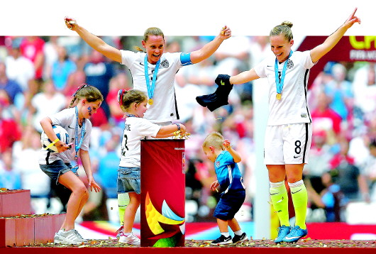 美国女足的两名“妈妈队员”与自己的孩子们一起庆祝夺冠。 新华社发