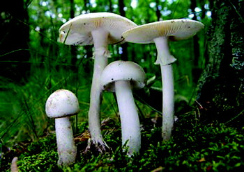 白毒鹅膏菌呈纯白色,内部实心或松软,菌托肥厚近苞状或浅杯状,菌环生柄之上部。夏秋季分散生长在林地上。此蘑菇极毒。毒素为毒肽和毒伞肽。中毒症状主要以肝损害型为主,死亡率很高。