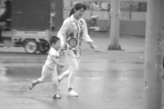 6日枣庄降下大雨,将很多没有准备的市民淋在了路上。据预报显示,7日、8日降雨天气将短暂停歇,而9日还会有降雨出现。图中,一位母亲牵着孩子的手快走前行,躲避大雨。 本报记者 袁鹏 摄影报道