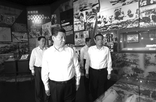 下午3时20分,习近平等领导同志来到位于卢沟桥畔的中国人民抗日战争纪念馆。他们拾阶而上,步入纪念馆序厅,并依次从花台上拿起鲜花,敬献在象征中华民族团结抗战的大型浮雕《铜墙铁壁》前。