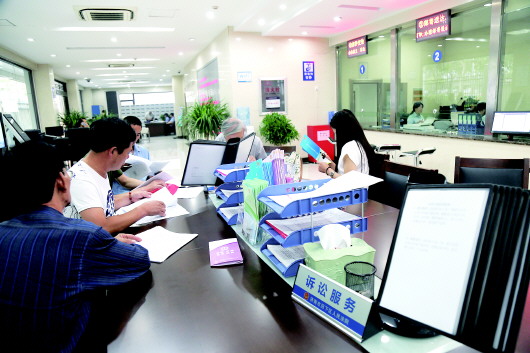 6月29日,济南历下区法院立案庭内,前来立案的市民在填写、查阅材料。 通讯员 刘科 摄