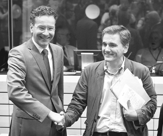 7日,在比利时布鲁塞尔,欧元集团主席戴塞尔布卢姆(左)与希腊新任财长察卡洛托斯在欧元区财长会议上握手。 新华/法新