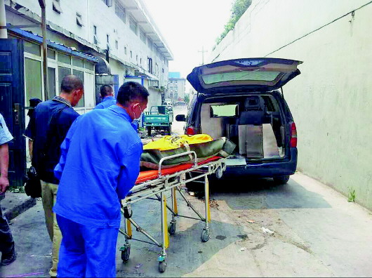 猝死男子被抬上殡葬车。 本报见习记者 王建伟 摄