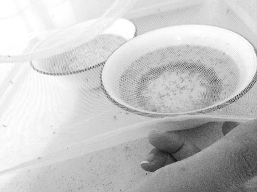 ▲水中的小黑点就是蚊子的幼虫,积水处最容易繁殖蚊子。