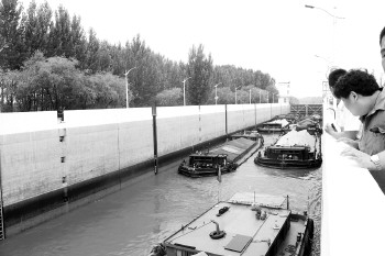 本报济宁7月7日讯(记者 庄子帆) 7日中午12点,关闭近一年的韩庄船闸终于恢复正常通航,这意味着京杭大运河东线航道贯通。不过,韩庄虽恢复正常工作,船闸下游水位仍没达到最低通航标准,船舶过往此处仍进行限制性通航。