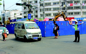 7日,萍乡路道路桥梁改造加固工程半封闭施工,周边道路进行调流。 吕璐 摄