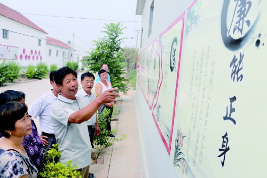 7日,无棣县海丰街道东辛村的干部群众正在刚刚落成的廉政文化墙前驻足观看。为提升基层党员干部廉洁自律意识,筑牢拒腐防变思想防线,近年来,无棣县围绕“干部清正、政府清廉、政治清明”的“三清”目标,把廉政文化建设与基层党风廉政建设和新农村建设相结合,从农村基层入手大力宣传廉政文化。该县以绘制廉政图画、打造廉政文化墙等群众喜闻乐见的方式弘扬清风正气,唱响廉政“好声音”,营造“廉荣贪耻”的浓厚氛围,深受群众欢迎,并使民众从中受到潜移默化的教育。