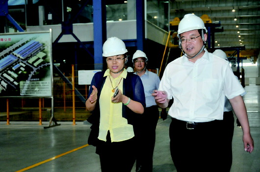 威海市环翠区区委书记林红玉(右一)在工厂调研。 本报记者 王震 摄
