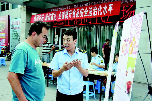 7月2日上午,商河县食品药品监督管理局的工作人员在中润时代广场门前进行食品药品安全活动宣传。活动现场,不少市民在宣传板块和展示台前驻足。记者发现在整个活动期间,市民询问最多的是食品安全问题。市民王先生前来咨询:“夏天到了,易诱发食物中毒,动不动就拉肚子,这平时该咋注意?”