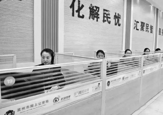 滨州市网上公安局民生警务热线工作人员正在接听群众热线。