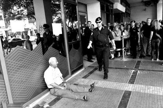 3日,在希腊第二大城市塞萨洛尼基,77岁的退休老人乔治·查兹法提亚迪斯打算为妻子取120欧元的退休金。他跑了三家银行,都没有领到钱。在第四家银行,查兹法提亚迪斯依然被告知不能取钱。筋疲力尽的他崩溃地坐到银行前面的地上,失声痛哭起来。这个画面,被摄影记者捕捉下来,成为普通人饱受国家债务危机之苦的一个缩影。