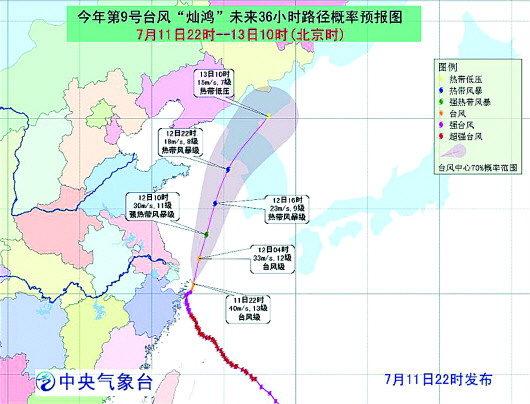 据新华社济南7月11日专电 据浙江省气象台发布消息,第9号台风“灿鸿”11日16时40分在浙江舟山普陀区朱家尖登陆,登陆时中心附近最大风力14级,强度为强台风。山东省气象台通报,受此影响,预计12日开始山东南部沿海风力将加大,鲁东南和半岛地区将出现较强降雨。