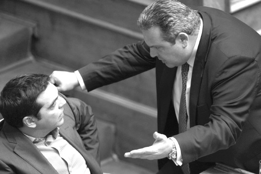 7月11日凌晨,在希腊首都雅典,希腊总理齐普拉斯(左)和国防部长坎梅诺斯在议会会议上讨论。 新华社发