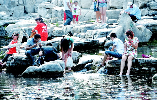 12日,护城河,游客泡脚避暑。当日济南气温再度升高,酷热难耐。 本报记者 周青先 摄