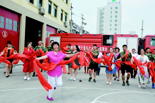 艺术团的妈妈们与消防战士一起扭秧歌。 记者 王倩 摄