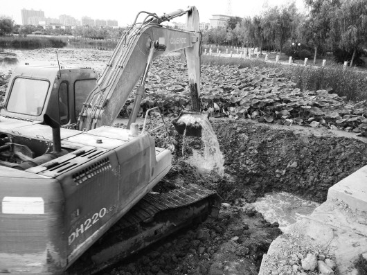 7月11日中午,彩虹桥改造清淤时,挖掘机挖裂了自来水管道主管线,随后施工工人联系了彩虹湖管理委员会的工作人员。“我们不知道这条管线是哪个单位的,不知道要找谁维修,就联系了彩虹湖管理委员会,工作人员来查看了几次,也不清楚究竟是哪里出了问题。”