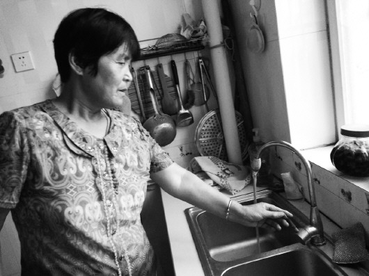 19:10,家住双湖花园4楼的魏女士正打算出门散步,就听到家中开着的水管处发出“嗤嗤”声,来到厨房发现水管中开始流出水,她赶忙用舀子接了水倒进了刚买的水桶中。