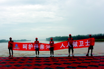 志愿者在黄河边呼吁人们“呵护母亲河,人人做卫士”。