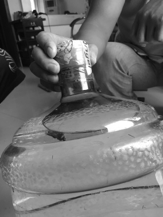 通过仔细观察水桶表面记者发现,水桶的表面有凹陷,而且有划痕,看起来有些旧,而且,从外观上看,这种材质的水桶比常见的水桶的透明度较低。并且在水桶的底部印有聚酯PET标识。据了解,PET桶俗称橡皮桶,其价格相对低廉。PET桶在高温下会分解对人体有害的物质,而桶装水桶都是循环重复使用,必须有高温消毒过程,因此早在2004年,国家质检总局就下发《定型包装饮用水企业生产卫生规范》,根据规定,桶装水生产企业重复使用的水桶必须为PC桶,PET桶由于加热后会释放有毒物质是被严令禁止的。