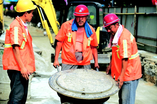 13日下午3点左右,济南市解放路一工地,工人在高温中操劳。 本报记者 周青先 摄