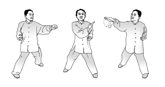 马步抓空:右掌挑于左肩齐,平抹至胸前,立掌回带抓于腰际,左右式。