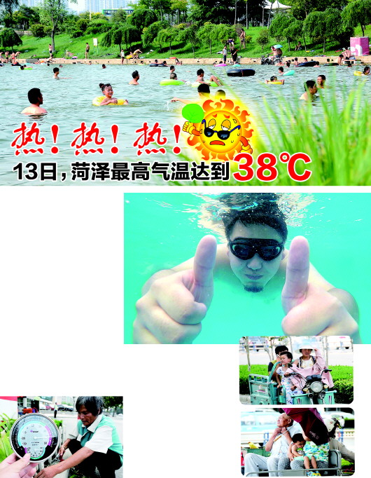 烧烤模式开启。13日,菏泽最高气温达到38℃,部分地表温度甚至到了40℃,正式进入“三伏天”。专家也提醒市民入伏后应注意防暑,尽量减少在白天户外活动。耐不住高温,不少市民前去赵王河、游泳池寻清凉。但在骄阳炙热的考验下,仍有一部分人冒着高温坚守着自己的岗位,向他们致敬。