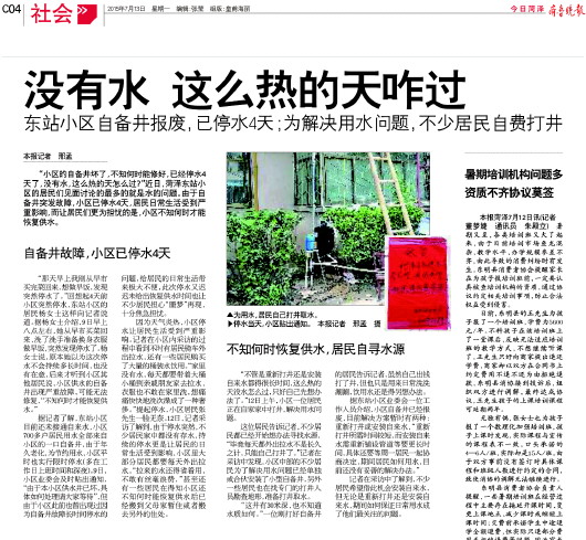 对于在未接通自来水期间居民的供水问题,王业明告诉记者,由于东站小区居民较多,夏季用水量又大,目前的想法是让自来水公司在小区内设立临时供水点,方便居民取水。“但由于无法计量每户居民取水量,水费只能根据总取水量均摊,这样一来需要先向居民收取部分水费然后多退少补。但这一方案能否被居民接受,以及接受后的具体实施方案还需要小区业主委员会综合居民意见进一步开会商讨。”