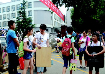 上午11点,结束考试的考生背着画板陆续走出考场。在门口等候的家长赶紧上前接过孩子手中拎着的略显沉重的画板和马扎。