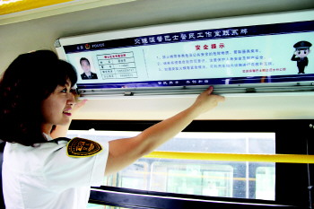 13日,交运温馨巴士联合崂山北宅派出所的民警在469路、470路、639路的公交车厢里安装警民联系卡,卡上印有分管该片区治安警官的联系方式,乘客如在车内遇到性骚扰、被盗或其他紧急事件时,可第一时间打电话联系民警解决处理。