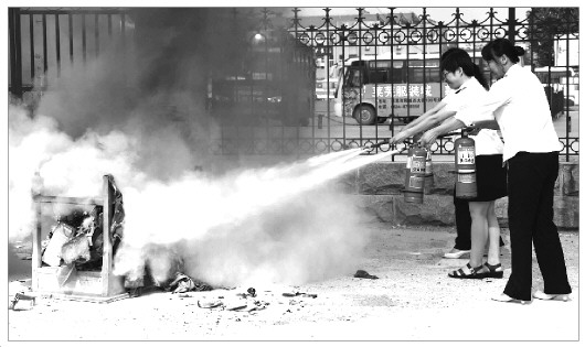 近日,莱芜长运公司组织各单位进行一系列消防演练,通过演练活动提高了工作人员自救意识和逃生水平,经过实际操作,安全员、驾驶员、站务员以及加气工等工作人员掌握了灭火器等消防器材使用方法。据统计,全公司有200余人次参加了演练。图为莱芜汽车站工作人员正在进行灭火。