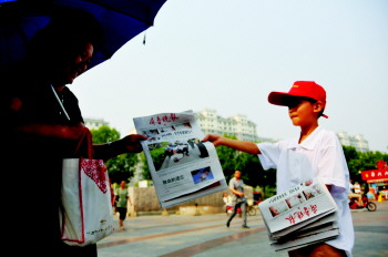 13日,初次卖报的小报童朱柯翰又卖出了一份报纸。当天,市气象台发布了高温橙色预警,最高温达到了38℃。高温并没有阻挡住小报童的卖报热情,营销首日,全市200余名小报童卖出了6000余份报纸,部分小报童仅用半小时便卖完了30份。