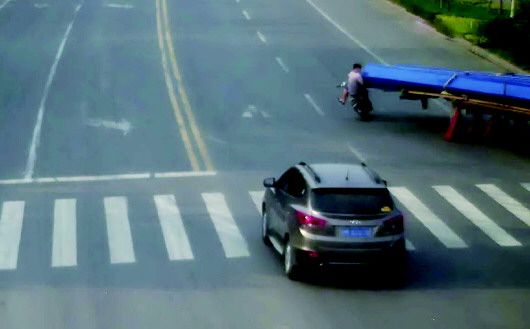 民警立即调取了事发现场的监控录像,发现事发前连续几秒内,受伤男子骑车时一直向右侧扭头朝着后方,持续几秒钟后,一辆装载长管的拖拉机迎面接近男子,而男子由于一直看后方没有发现,一下子撞在了该车尾的货物上,重重地摔在地上。