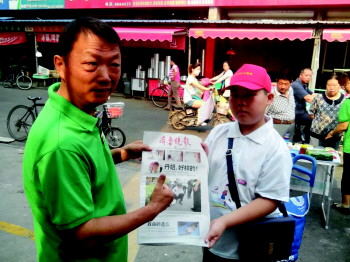 市民张先生买报时鼓励小报童于泽正。 本报记者 刘光斌 摄