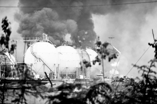 16日上午,事发厂区浓烟滚滚,液态烃储藏罐在燃烧。 本报记者 刘涛 摄