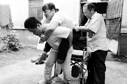 ◥由于父亲行动不便,将瘫痪的母亲背出来晒太阳,是韩长城每天的任务。